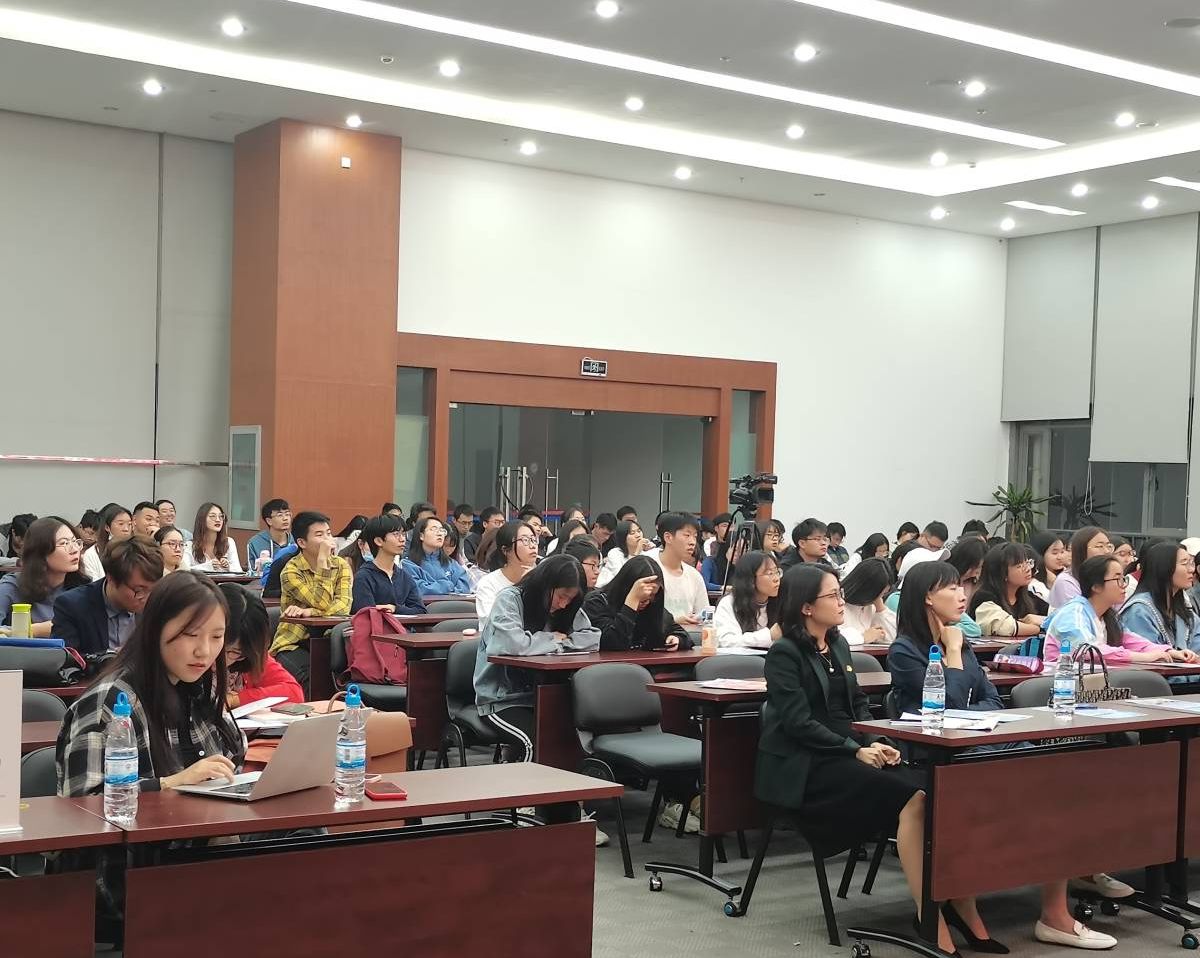19点,讲座正式开始。首先,唐老师和李老师向同学们做自我介绍。接下来,两位老师分别向同学们介绍求职的途径并教授相关技巧,以自己的亲身经历告诫同学们要积极进取。最后,两位老师为同学们答疑解惑。