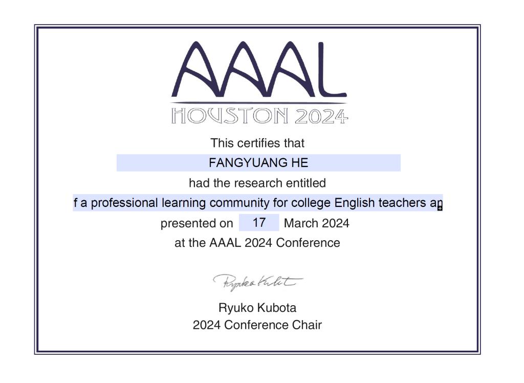 3月15日至19日,由美国应用语言学学会(American Association of Applied Linguistics,简称AAAL)主办的2024年国际年会在美国得克萨斯州休斯顿市成功召开,来自世界各地的语言学界代表齐聚一堂,共同探讨应用语言学领域的最新研究成果和发展趋势。我院英语系和方圆博士参加本次年会并进行了圆桌会议发言。