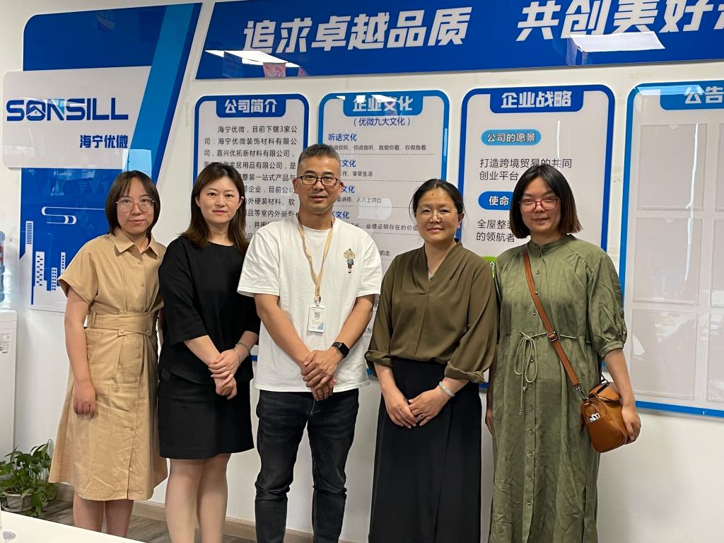 (原文学院)2005届英语专业毕业生,于2015年创建海宁优微装饰材料有限公司,现任公司总经理。陆宏勇总经理对团队的到来表示欢迎,带领团队参观了企业,详细介绍了企业资质、发展历史、业务范围等内容,解读了海宁市现行的人才引进政策,剖析了海宁市及周边地区外贸行业的发展现状与前景,以企业现有的发展情况和人才需求情况为例,提出了外贸型企业对人才培养的具体建议。团队成员与陆宏勇总经理就毕业生就业情况、人才培养方向、学生实习实践方案等内容进行了充分的沟通交流。陆宏勇总经理对我院毕业生的综合能力深表认可,希望双方持续加强在产教融合、创新创业教育等方面的合作,实现校企双方高质量发展。