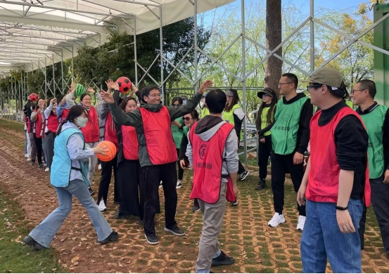 老师们通过“破冰行动”分成四队,“红土高原,红红火火”的红队、“走向辉煌,王中王”的黄队、“青山绿水,我们最美”的蓝队和“一心一意,小绿无敌”的绿队。在“动一动、跳一跳、乐一乐”的活动宗旨下,拓展活动中的“毛毛虫比赛”、“传球游戏”和“一圈到底”三项游戏活动让全体老师都踊跃参加到活动中,充分展示了教师们积极向上、奋勇勃发的精神风貌,收获了健康快乐的好心情。