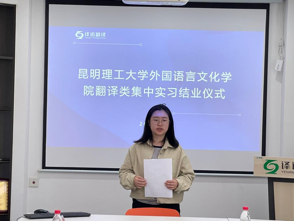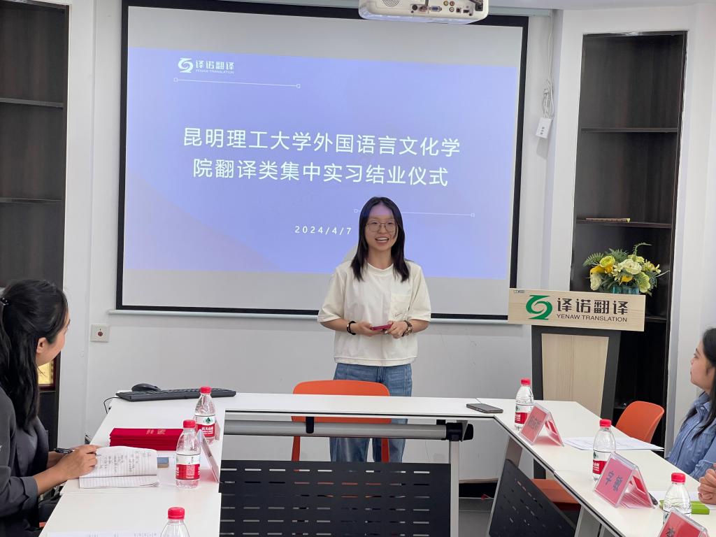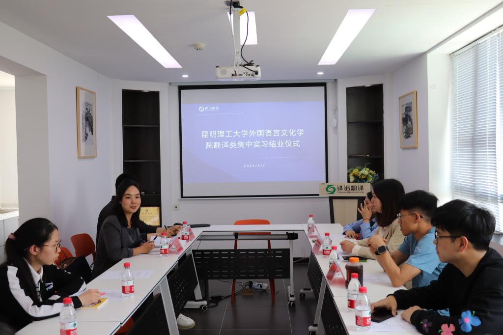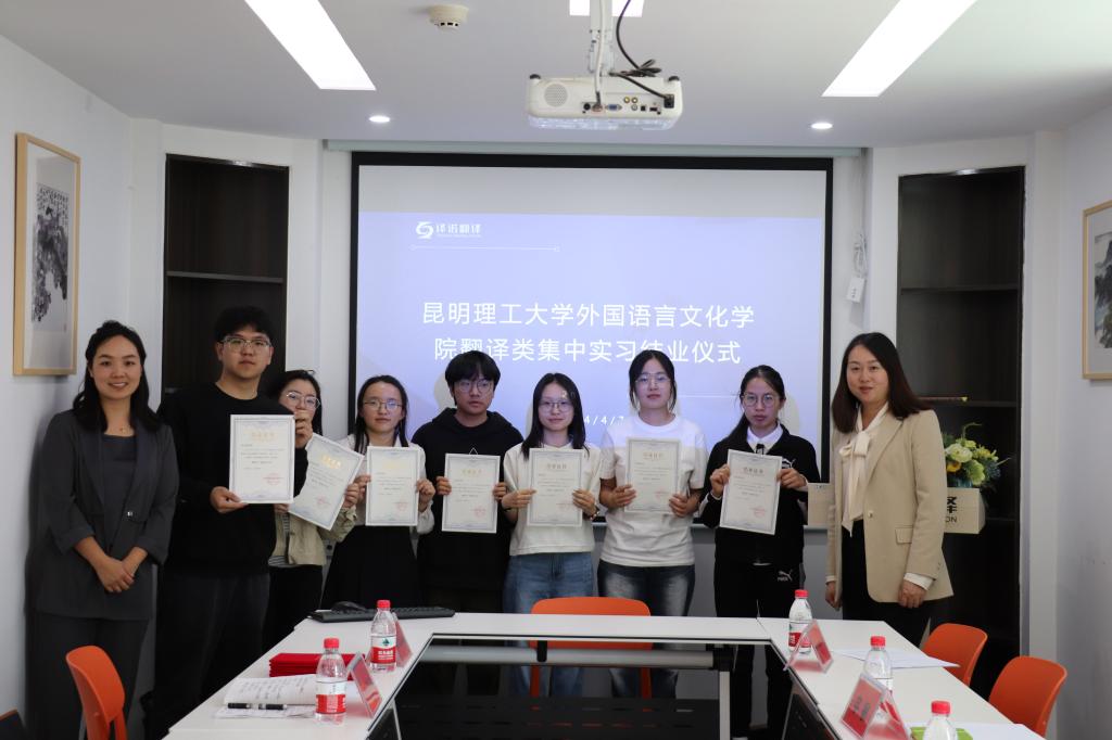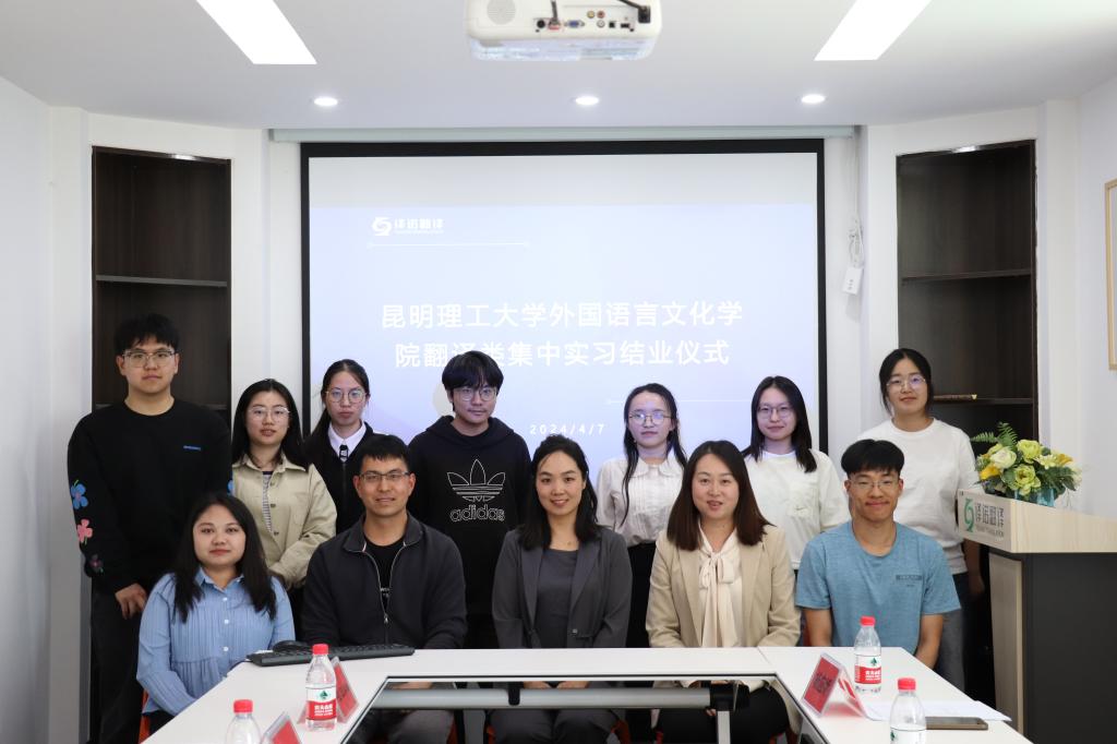 2024届毕业生翻译类集中实习结业典礼在昆明译诺翻译服务有限公司顺利举行。副院长马倩、昆明译诺翻译服务有限公司总经理字敏、企业指导教师及相关负责人、我院实习带队教师胡权和2024届七名毕业生参加了结业仪式。