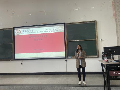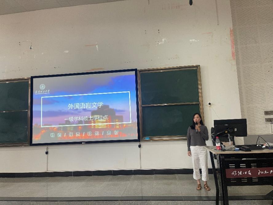 为进一步提升备考效率、拓宽信息渠道、增强学生的信心与勇气,学院学科科研办主任高维博士介绍了外国语言文学一级学科硕士点研究生招生方向、导师团队和课程设置等内容。学院MTI教育中心主任马群英博士绍了翻译硕士专业学位点研究生培养成果。