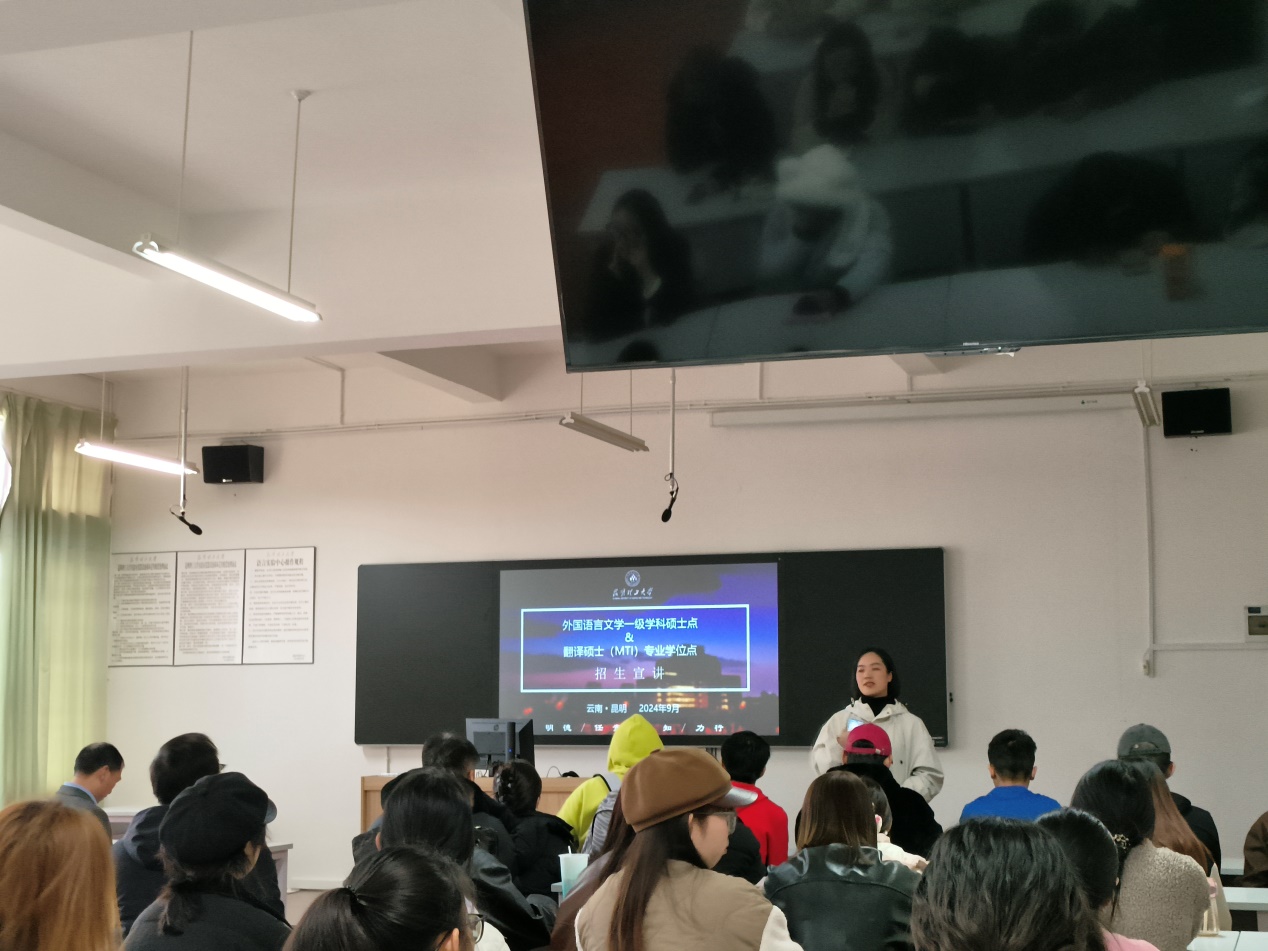 马倩介绍了学院研究生招生情况、培养方案,以及学院研究生毕业生高质量就业情况,鼓励学生报考本院硕士研究生,在学院继续学习成长。胡权博士重点强调了英语专业报考注意事项,列举了3个外语类报考院校供参考。
