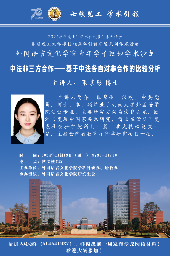 在博文楼312会议室开展了2024年第八期青年学致知学术沙龙活动。此次沙龙以“中法非三方合作——基于中法各自对非合作比较分析”为主题,是TYmanga