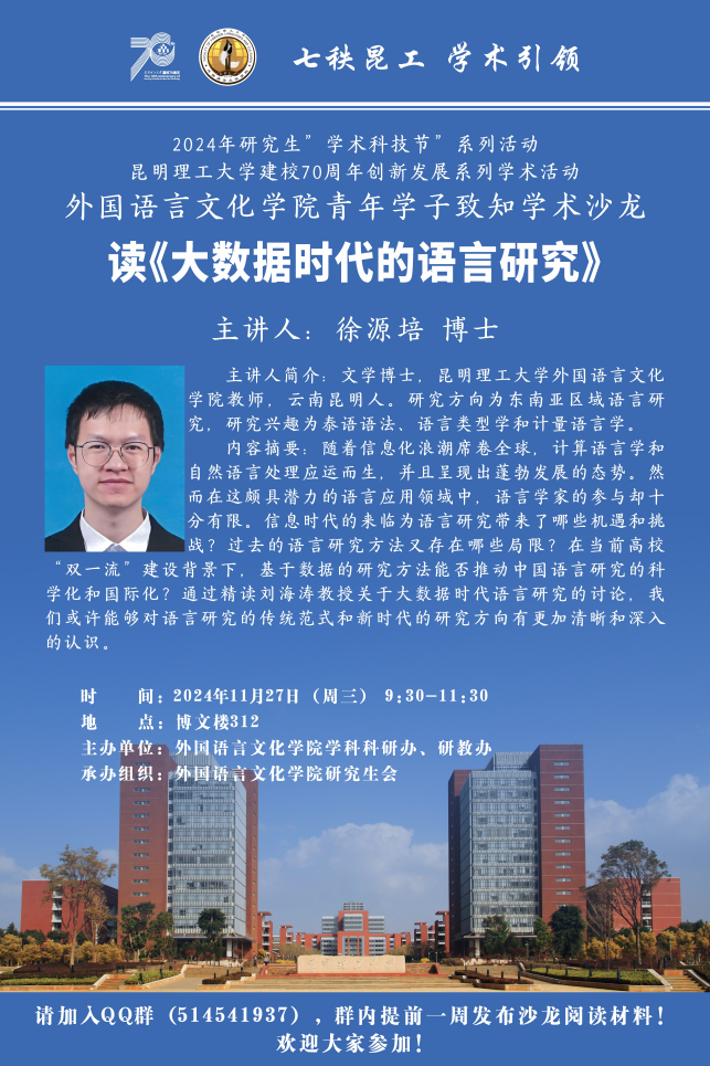 在博文楼312会议室开展了2024年第九期青年学子致知学术沙龙活动。此次沙龙以“大数据时代语言研究与趋势”为主题,是TYmanga
