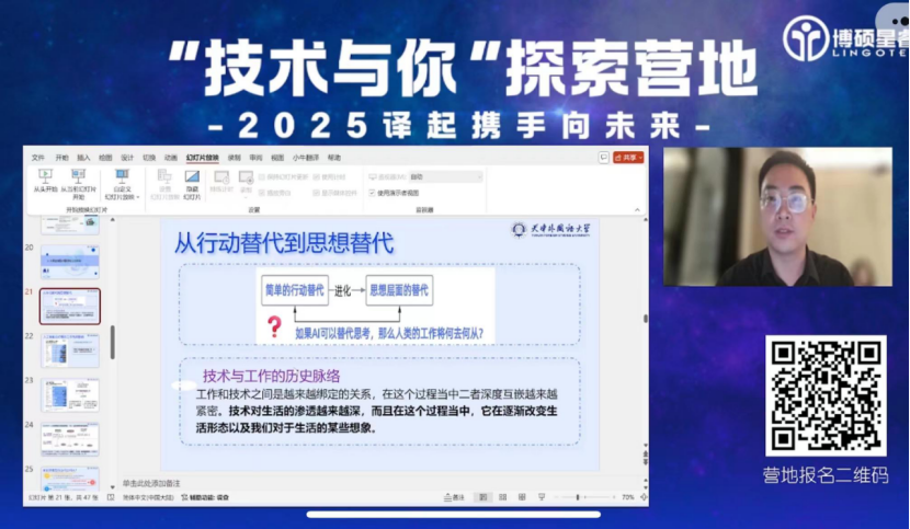 组织英语类专业本科学生和翻译硕士研究生参加了由北京博硕星睿·翻译技术教育研究院举办的2025年寒假探索营线上课程学习项目。探索营以“技术与你”为主题,聚焦于大模型应用的广阔前景、技术与人类关系的哲学思辨以及语言专业学生在新时代的机遇与挑战,邀请了王华树、崔启亮、朱华、丁翔羽等高校教师以及语言服务行业语言工程师担任课程主讲教师。