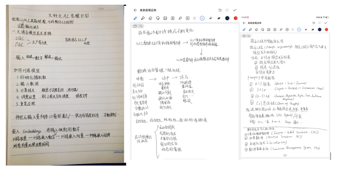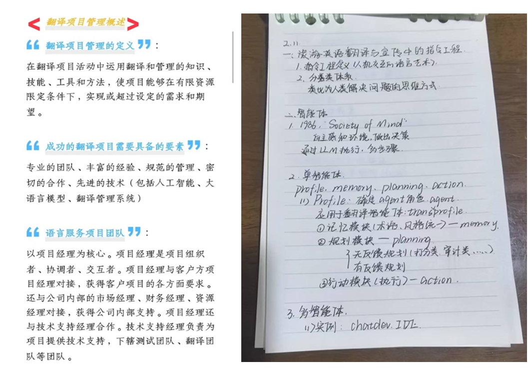 第一部分课程内容为大语言模型应用。授课老师深入浅出地讲解大语言模型知识,涵盖其运行机制及其在翻译实践中的应用逻辑等核心要点,包括如何使用大语言模型进行译后编辑及翻译质量评估、如何使用智能笔记辅助技术提高口译笔记效率等。