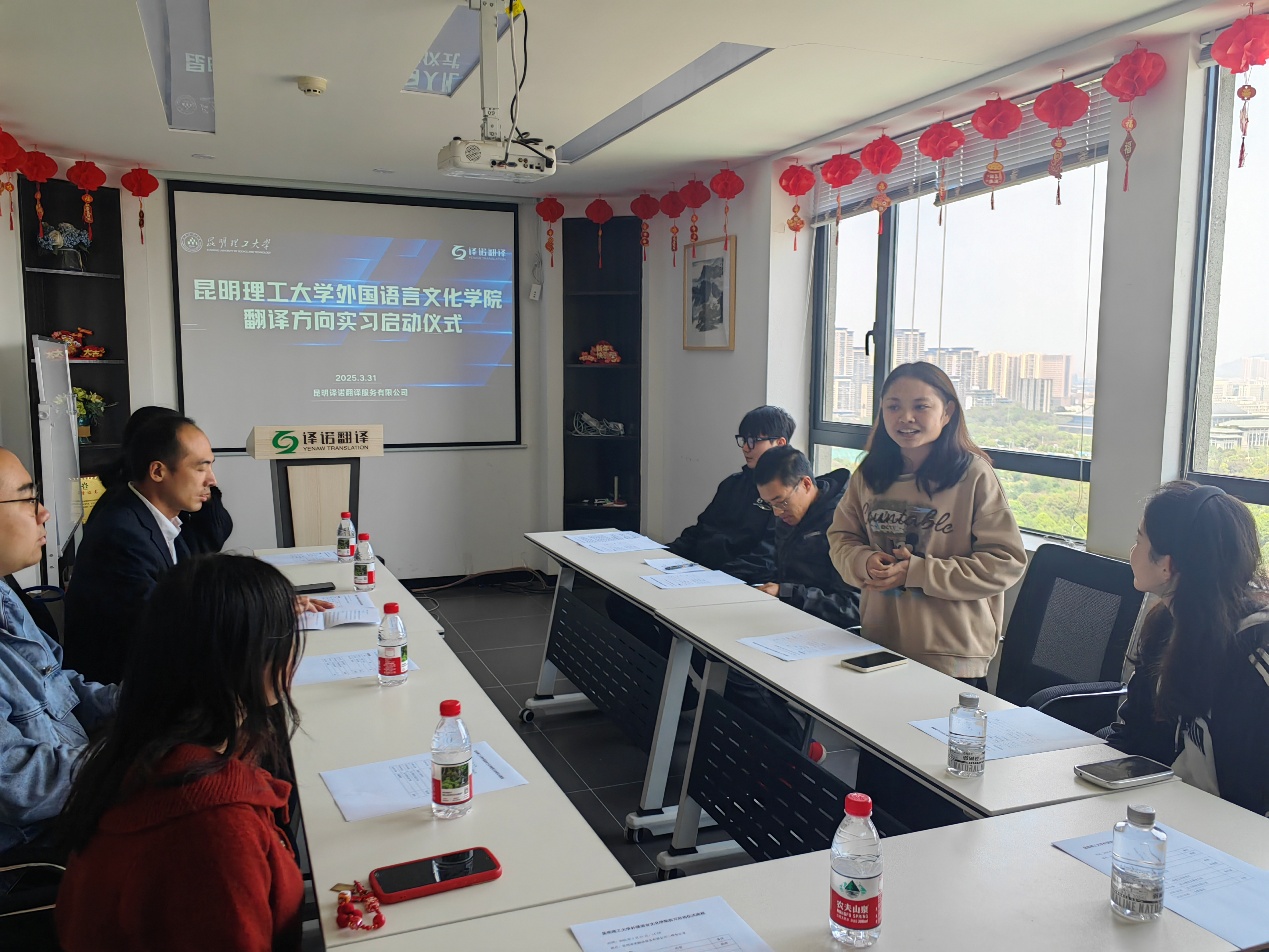 2025届翻译专业毕业生集中实习启动仪式在昆明译诺翻译服务有限公司举行。英语系主任任佳佳、实习带队教师茶秋思、译诺公司管理层代表、企业导师团队及学院实习生共同出席活动。