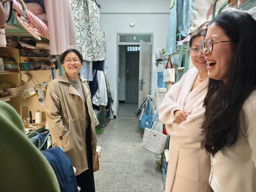 走访过程中,王英与研究生们亲切交流,细致询问了同学们的日常学习安排、生活适应情况以及未来发展规划。她强调,研究生阶段是学术能力提升和综合素质培养的关键时期,希望大家在专注科研的同时,也要注重身心健康,合理规划时间,做到学习与生活平衡发展。