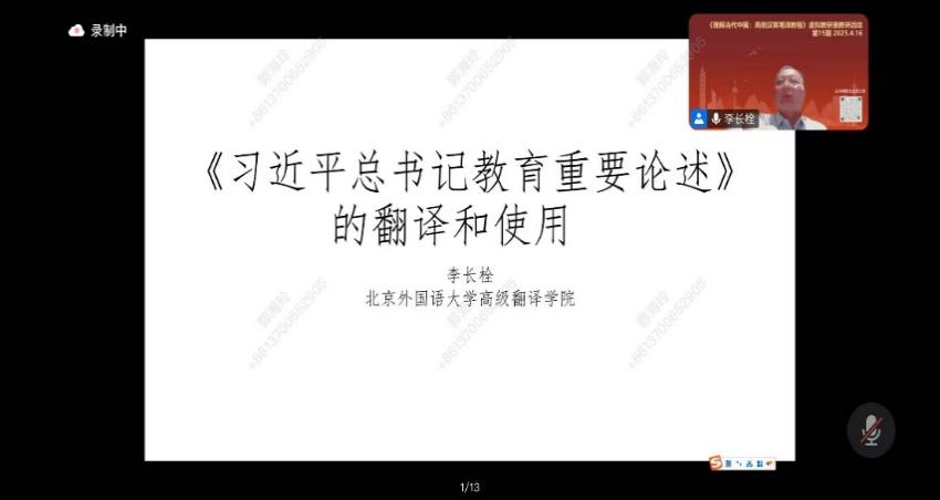 本次虚拟教研室活动以“中国特色话语体系翻译实践与探索——《习近平总书记教育重要论述讲义》的翻译与使用” 为主题,采用“理论讲解+案例分析+互动研讨”的立体化模式进行,旨在系统阐释课程思政建设与理解当代中国翻译系列课程教学内容深度融合的路径。北京外国语大学李长栓教授以《习近平总书记教育重要论述讲义》英译实践为例,围绕《习近平总书记教育重要论述讲义》英译中“如何构建融通中外的教育话语体系”展开交流,深入解析中国特色话语体系的翻译策略,强调外语教师需在翻译教学中强化政治意识,准确把握“教育强国”“立德树人”等核心概念的国际表达。指出外宣翻译过程中需坚持“三贴近原则”,在忠实原文思想内涵的前提下,兼顾学术严谨性与传播有效性,贴近国际受众认知习惯。