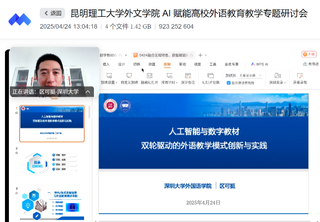 区可挺以“人工智能与数字教材双轮驱动下的外语教学模式创新与实践”为题,介绍了深圳大学外国语学院开展AI赋能学校英语教学改革的实践,并以融合区域特色数字赋能的外语数字教材《深圳故事:大学英语阅读教程》的编写为例,从数字化教材编写的理论依据、教学内容选择、线上线下结合的教学路径、过程性考核方法等方面展示了数字教材在促进外语教学的模式创新和课程思政建设方面所起到的平台作用。