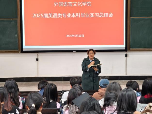 2025届英语类专业本科毕业实习总结会在博文楼100报告厅举行。学院院长王英、党委副书记孙冠华、副院长马倩、英语系全体教师及2021级英语类专业本科生参加了会议。