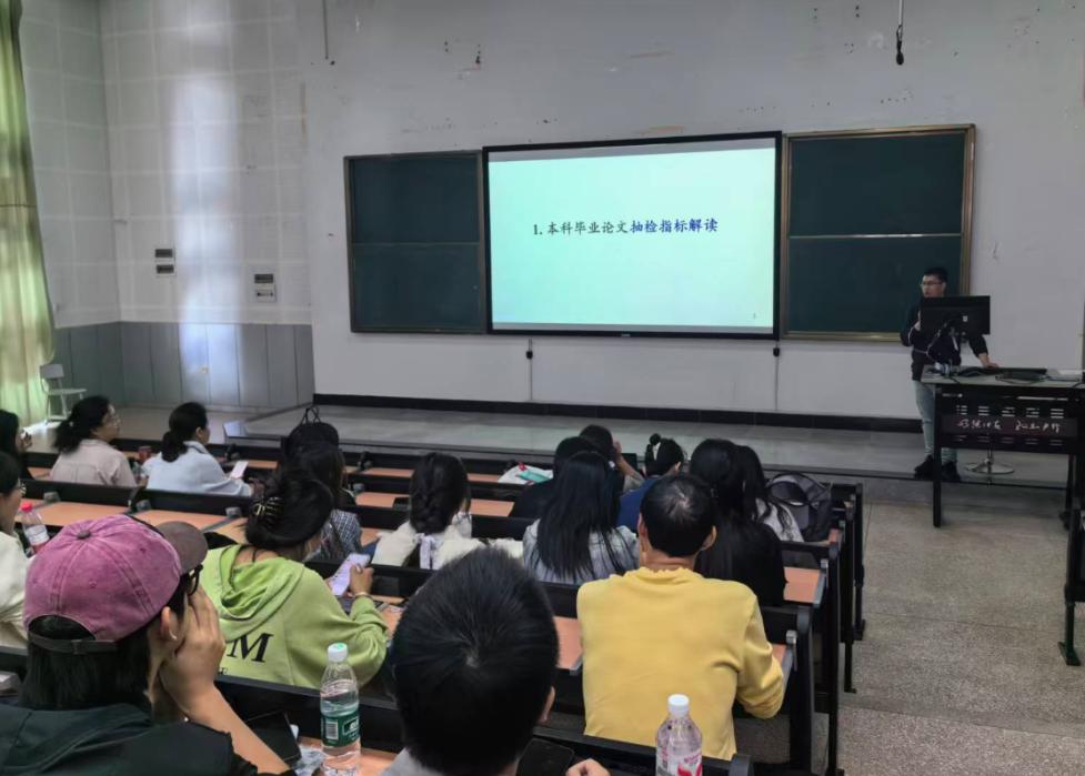 英语系副系主任胡权博士对云南省本科毕业论文抽检的评议要素以及本科毕业论文的选题要求、逻辑构建、专业能力以及学术规范等指标进行了详细解读,对毕业论文各阶段安排以及毕业论文工作的两大关键变化进行了说明:其一,论文启动和答辩时间提前,需合理安排毕业论文撰写各个环节;其二,学校颁布了论文中关于AI工具使用的相关规定,杜绝学术不端。随后,英语系全体教师逐一向同学们介绍了自己的研究领域和论文指导方向。在师生现场交流环节,学生结合自己的研究兴趣和意向导师进行了面对面交流,初步确定了毕业论文选题方向。