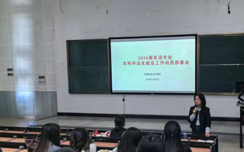 2026届英语专业本科毕业论文及就业工作部署会在博文100举行。学院院长王英、党委副书记孙冠华、英语系全体教师、2022级英语专业本科生、辅导员以及学工办、教务办相关管理人员参加会议。会议由英语系主任任佳佳博士主持。