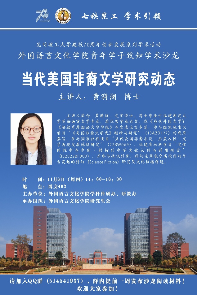 于博文楼403教室开展2025年第二期青年学子致知学术沙龙活动。本次沙龙以“美国非裔文学研究”为核心主题,特邀学院黄漪澜博士主讲,外国语言文学专业全体学术型硕士研究生参与交流。