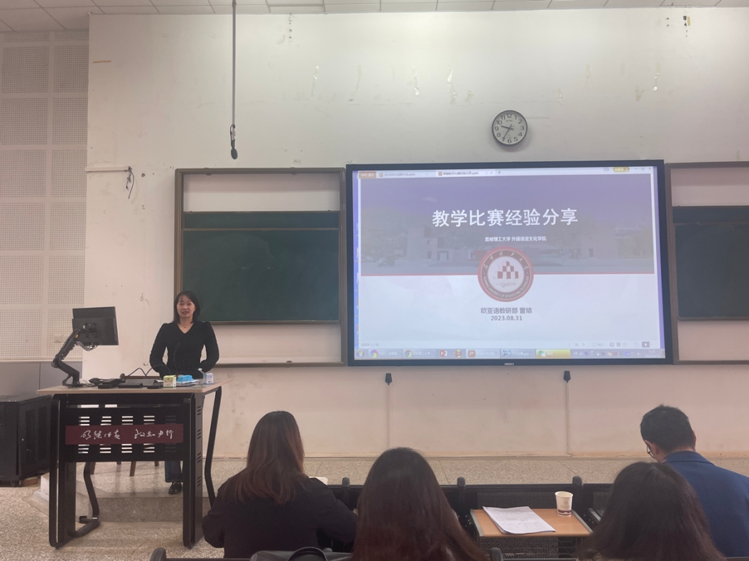 曾婧老师总结了教学比赛成长过程中碰到的难点和痛点,凝练出了相应的对策和解决办法,现场消解了众多教师存在的困惑。主要聚焦教学比赛的性质、准备的方法、外语课程教学比赛特点进行分析和说明,提出要理性分析比赛和精力投入的关系,斟酌选择比赛的类型,基于比赛性质进行教学比赛准备和设计。同时,通过展示参赛课件,详细阐述了参加校级教学比赛的教学设计策略和展示方法,将情景设计、思政教育、丰富练习、启发式教学理念及趣味性游戏进行有效融合,为各位老师提供借鉴和参考。
