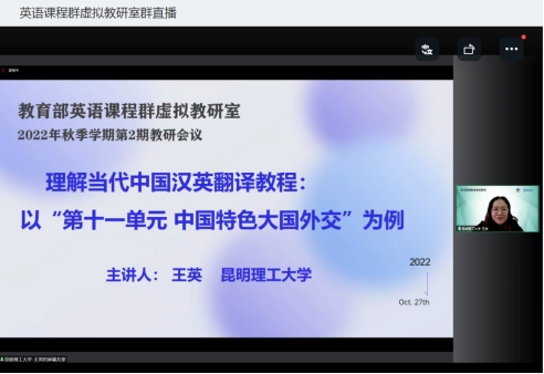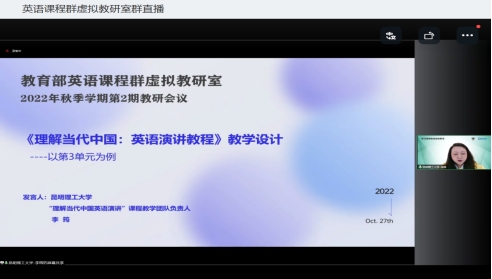 王英教授、李筠老师作为虚拟教研室院校代表应邀参加了北京外国大学李莉文教授领衔的教育部首批虚拟教研室建设试点“教育部英语课程群虚拟教研室”举办的2022年秋季学期第二期教学研讨会,并在研讨会上进行了说课分享。该虚拟教研室成员院校的百余名教师们参加了本次教研活动。