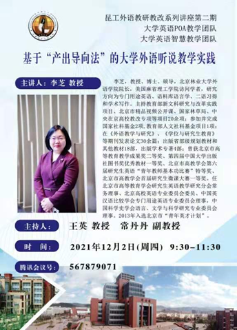 特邀北京林业大学外语学院院长李芝教授作了一场主题为“基于产出导向法的大学外语听说教学实践”的线上学术讲座,我院院长王英教授主持,共80余名教师一同聆听了讲座。