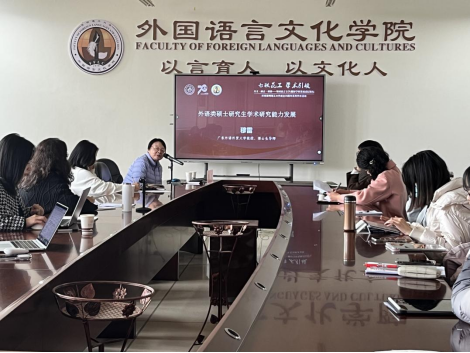 在博文楼312室举行以“外语类硕士研究生学术研究能力发展”为主题的学术沙龙活动。本次活动由广东外语外贸大学穆雷教授主讲、王英院长主持,学院40余名研究生参加。