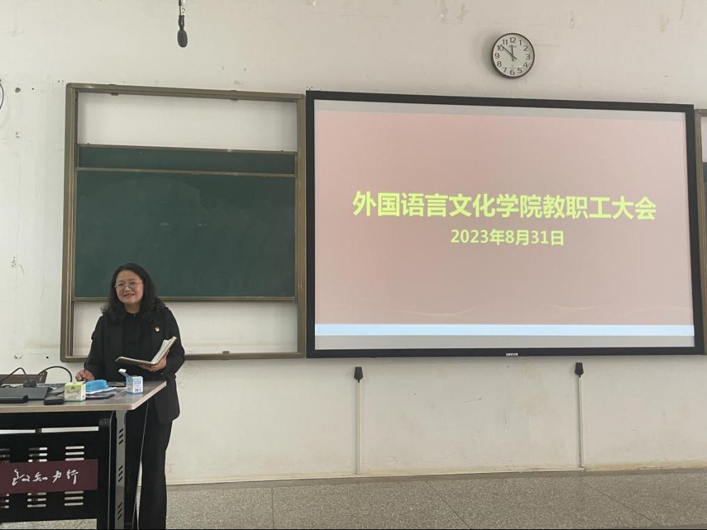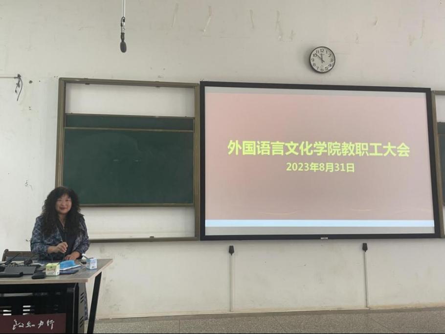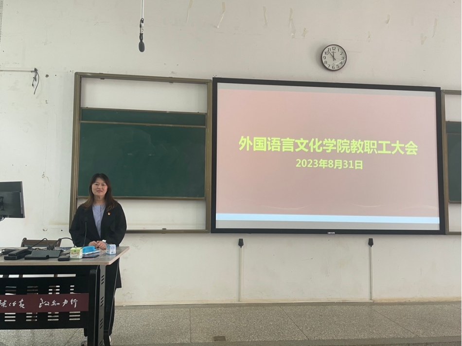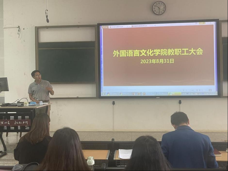 会上,邱清遐副书记重点介绍了暑假带队赴浙江海宁市开展外语类人才“访企拓岗促就业”活动及其成效,表示将在新学期继续做好毕业生去向落实工作,在毕业本科生就业率和升学率方面取得新突破,提升人才培养的质量。李泽生副院长就暑期开展的学术科研交流活动进行了简短汇报,表示将加强推进有组织科研进,做好做特国家社科基金申报系列活动,提升学院科研的软实力。杨玲副院长针对大学英语教学改革工作做了汇报,介绍了现阶段取得成果。计划不断完善大学英语教学指南以及教学大纲,组建学术英语提升教学团队,进一步推进课程质量档次以及一流课程申报等重点工作。马倩副院长围绕2023版培养方案修订工作,学科大赛的安排筹备组织工作,英语类专业学生的深造率提升和四八级过级率提升专项工作,本科专业建设等方面进行展望,希望与教职工同心同德,探索切实有效的工作方案,共同努力推进各项任务的开展。