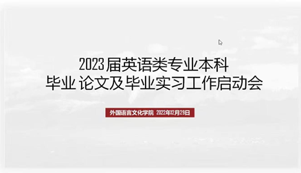 召开了2023届本科生毕业论文及实习工作启动会,旨在落实学校关于做好2023届本科毕业论文工作以及毕业实习的相关要求,进一步规范学院英语类本科毕业生毕业环节过程管理,强化全面提高本科生毕业论文和毕业实习质量的行动自觉。学院领导、英语系全体教师、2023届本科生、学工办、教务办相关管理人员,以及校企合作实习单位代表约130余人参加了线上会议。会议由英语系主任任佳佳主持。