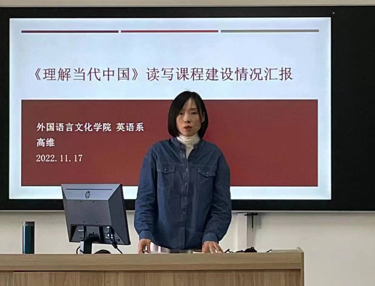 英语系主任任佳佳老师介绍了《理解当代中国》英语系列课程建设的整体情况,通过组建教学团队、理论学习和参加教育部的虚拟教研室交流活动,英语系教师积极探索将立德树人的目标贯穿到英语类专业教育每一个环节的创新路径。《理解当代中国》汉英翻译主讲教师毕凌成、演讲团队负责人李筠、高级英语读写主讲教师高维分别从课程目标、大纲编写、核心概念理解、语料库建设、MOOC资源建设和考核方式等实施要点进行案例分析,展示了课程思政的教学成果和教学设计理念。通过研讨,英语系全体教师认为英语类专业课程既蕴含着丰富的人类文化基因和价值范式,又因语言工具价值与人文价值并存的特点,在实践理想信念教育,传承中华文明这一教育精神方面大有可为。