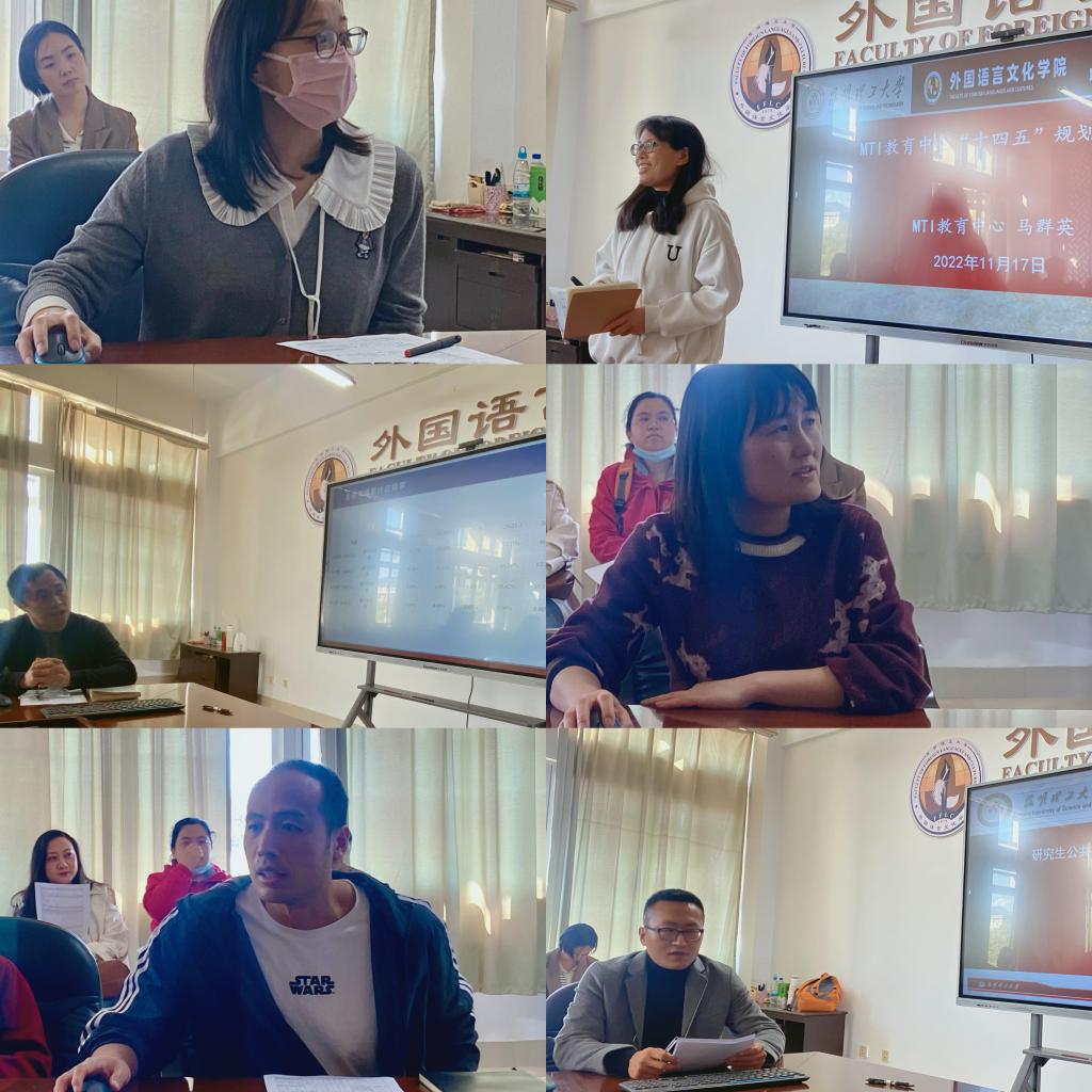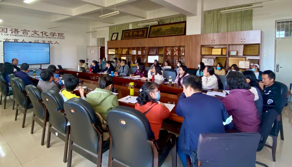 “十四五”核心指标任务,对学院人才队伍建设、专业特色发展、人才培养目标等整体发展目标作了明确要求。来自英语系、大学英语第一、第二教研部、研究生公共英语教研部、欧亚语教研部及翻译硕士(MTI)教育中心的六位系部主任分别从师资队伍建设、人才培养质量、科学研究成果、社会服务工作等方面对本系部发展现状及未来展望做了简要汇报,为学院发展目标实施路径建言献策。王英院长针对每个系部的建设规划进行了点评,提出了队伍建设目标要落实到人、规划目标实施路径要切实可行等建议。要求系部继续完善明确“十四五”发展规划目标,每个系部要突出工作的重点和特色亮点,系部之间要加强工作的沟通和协作,增强工作合力,共同推进学院整体工作的协同发展。