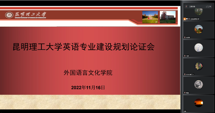 召开英语专业建设规划专家论证会。会议邀请了云南大学刘树森教授、上海交通大学彭青龙教授、华中科技大学许明武教授、哈尔滨工业大学刘克东教授、云南大学徐志英教授、大连理工大学陈宏俊教授,云南师范大学冯智文教授对我校英语本科专业建设规划进行论证,旨在激发新文科建设引领下的英语专业办学的创新驱动发展能力,优化完善一流英语本科专业培养体系,发挥理工科院校英语专业办学特色优势,提升英语专业人才培养质量。学院领导及英语系教师参加了论证会。论证会由云南大学刘树森教授主持。