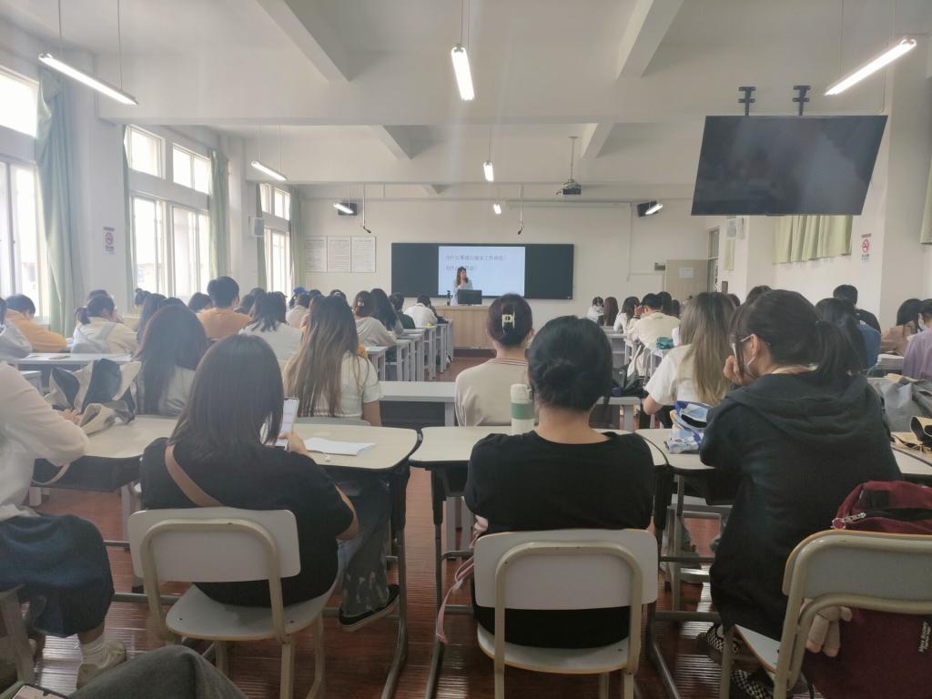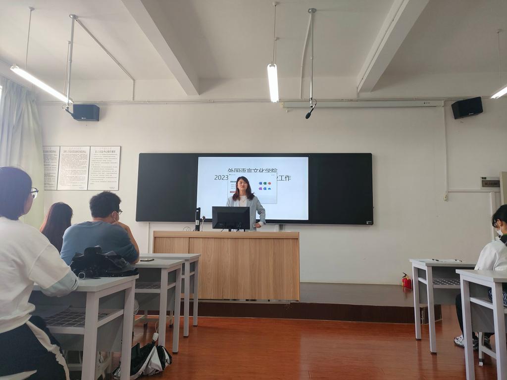 于博文楼403教室召开2023届毕业生考研就业工作推进会。院长王英、党委副书记邱清遐,2023届本科毕业生辅导员、班主任,以及全体学生参会。