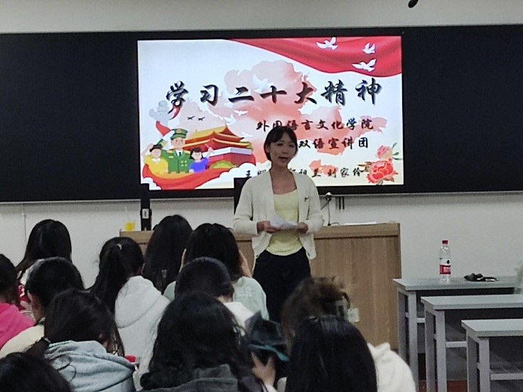 图 2 宣讲团成员王明月以“学习党的二十大精神”为题在2022级本科生班会上进行宣讲