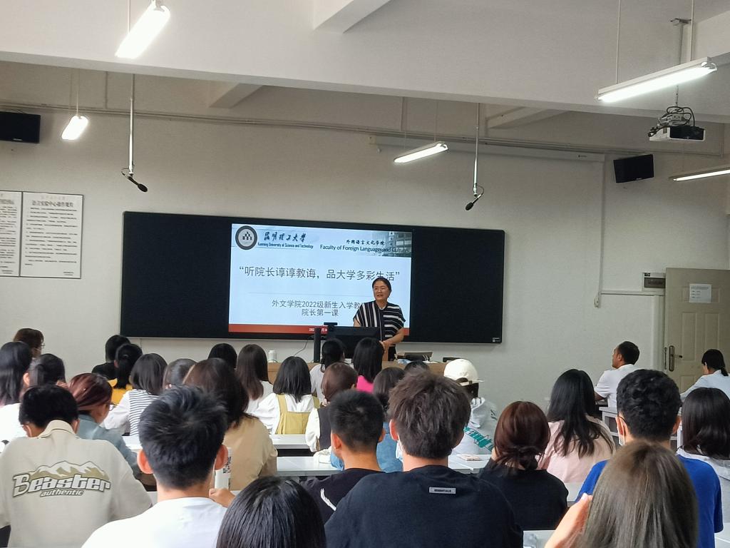 2022级新生入学第一课在博文楼403开讲。院长王英、副书记邱清遐,英语系负责人任佳佳、黄娟、高维,2022级本科生辅导员、班主任和全体新生参加会议。