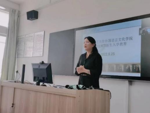 接下来,MTI教育中心主任马群英老师向同学们介绍了新生报道情况、院系领导的职责以及研究生培养的阶段性任务。马老师讲解得细致又认真,为同学们未来三年的规划做了详细又贴心的讲解,可谓是“干货”满满!此外,马老师还为同学能够更好地适应研究生生活方方面面提供了几点非常实用的建议。
