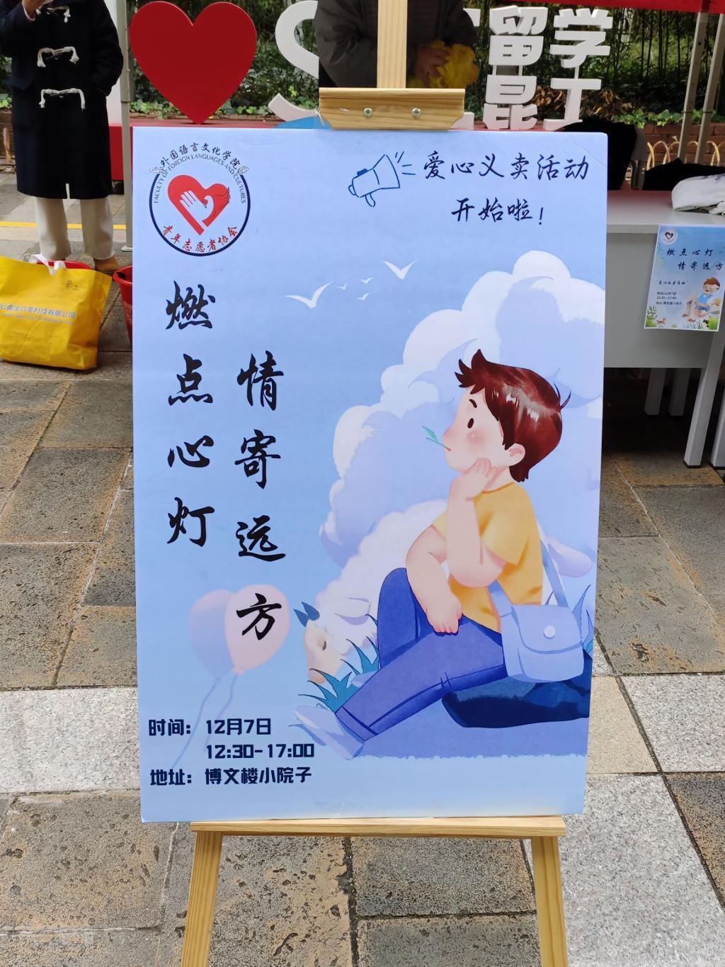 青年志愿者协会成功举办“燃点心灯,情寄远方”爱心义卖活动。来自全校多个学院的师生参加了活动,当天共筹集到义卖款760元,全部捐献给云南红十字会“滇苗助学”筹款项目,将温暖与希望传递给边远山区的孩童。