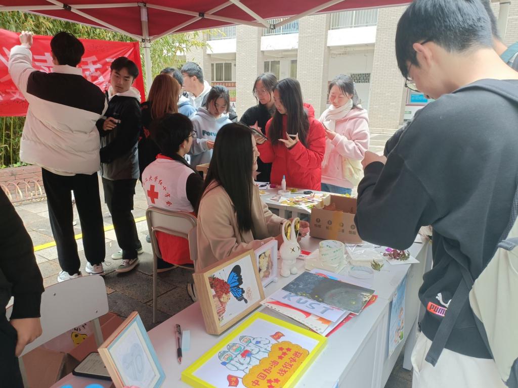本次活动集中展示了在学院青年志愿者协会“七秩芳华,桃李天下”衍纸手工制作活动中制作、收集到的优秀手工作品,这些作品与云南红十字会人道志愿服务队支持的物品一道,在博文楼小广场进行义卖。