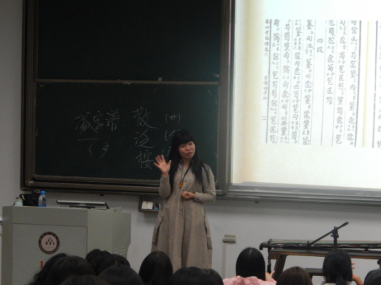 讲座伊始,一曲《高山流水》响起,曹晓萌老师就此开场的古琴曲引入今天的主题“古琴之美”。首先,曹老师向我们讲述了古琴典故如伏羲制凤凰古琴,并介绍了《广陵散》、《高山流水》等经典名曲。接着,曹老师讲解古琴的造型及摆放方式。上圆下方寓意着天圆地方,五弦到七弦的演变,不变的是中国古典文化的精髓。至于古琴的摆放,桌椅大小、比例尺寸也是各有讲究。曹老师播放了几段当今电视剧、电影中关于古琴演奏的视频,一一指出视频中古琴摆放的错误,以此强调古琴正确的摆放方式。随后,曹老师介绍了古琴谱,并亲自举例示范如何读谱与弹奏。随后,曹老师借《酒狂》向同学们展示了古琴的音色之美,表现了古琴三色:泛、散、按。最后,在曹老师弹唱的《悦人歌》、《梅花三弄》中,讲座正式落幕。琴音缭绕,歌声醉人,同学们收获颇多。