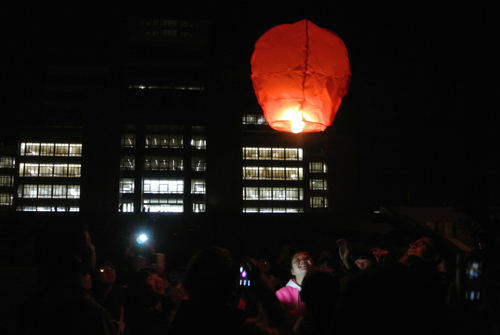 活动在团支书的号召下准时开始,参加活动的同学首先手拉手在图书馆正门前的空地上围成一个心型,接着团支书发给每位同学一张便利贴,要求每个人都要在上面用英文写上自己对祖国的祝福,然后贴在一块纸板上拼成“中国”两个字。活动的第二项为游戏环节,团支书开始拍掌的同时,一个瓶子也轮流在同学们手中传递,掌声结束时拿着瓶子的那位同学要为大家表演节目,本轮游戏结束后,共有三位同学为大家演唱了歌曲,他们精彩的演唱获得了大家热烈的掌声。活动的第三项为“畅想未来”,同学们轮流用英语讲出自己的梦想。活动的最后一项为“放飞梦想”,同学们在六个孔明灯上写上自己的梦想,最后一起点燃孔明灯,随着孔明灯的缓缓上升,本次活动也达到了高潮。