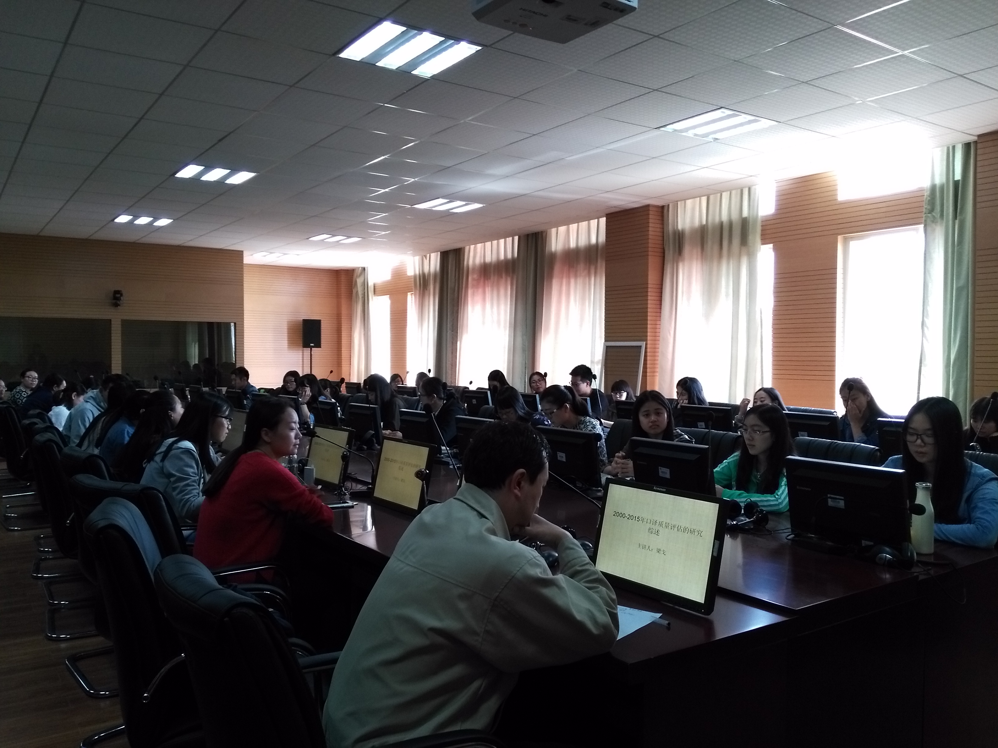 分会场首场讲座在博文楼214开讲。主持人为马开崇老师,报告人为2015级翻译硕士研究生梁戈和李莉同学,讲座点评人分别为郭怡军老师和杨玉老师。参加此次讲座的有学院全体MTI研究生。
