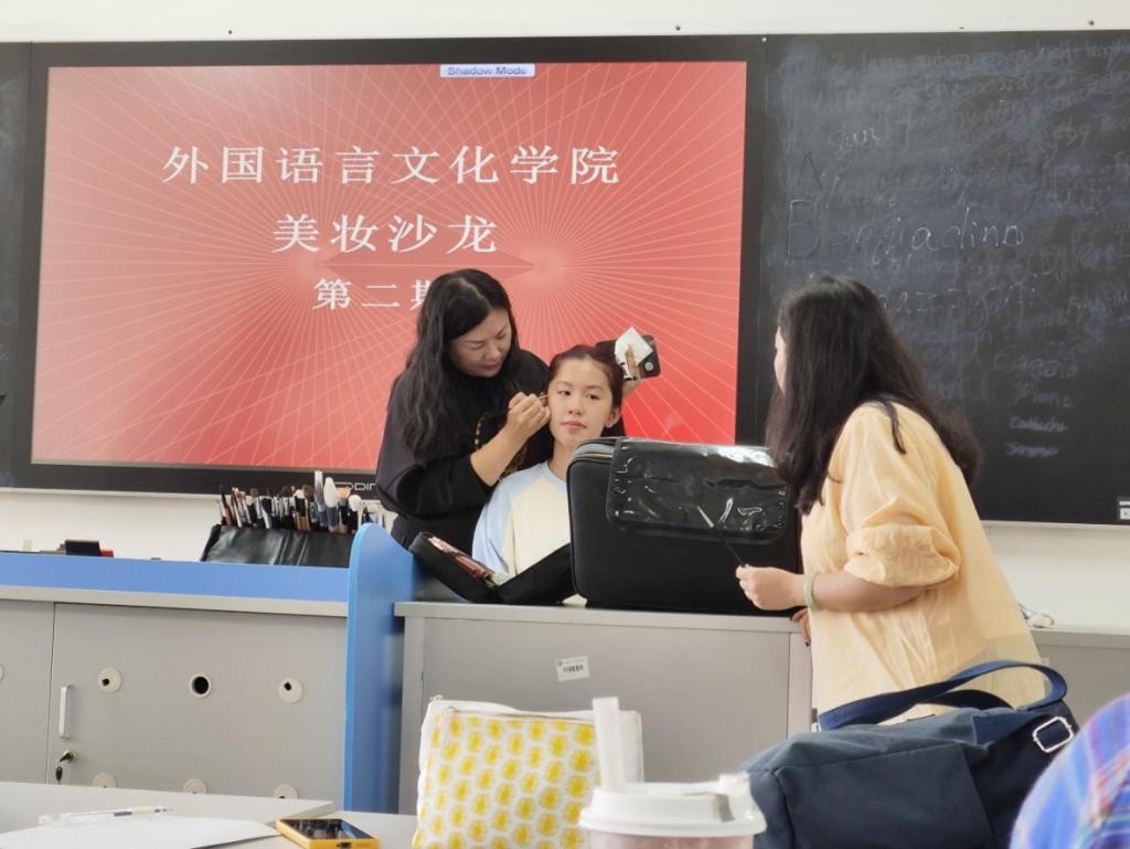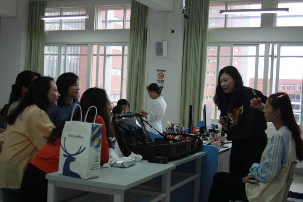 在活动过程中,师生们对化妆技巧表现出了浓厚的兴趣,指导老师讲解了关于如何上粉底,如何画眼线等方法,并介绍详细步骤和教程,对师生们提出的问题进行了详细的解答,师生们收获了很多关于化妆的知识,也在交流过程中增进了师生情谊。经过两个小时的化妆过程,精致美丽的妆容最终呈现在师生面前。